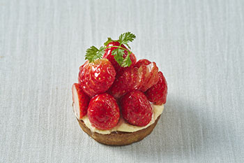 香ばしいピスタチオ風味のアーモンドクリームに旬の苺をたっぷりと飾った春のタルト。