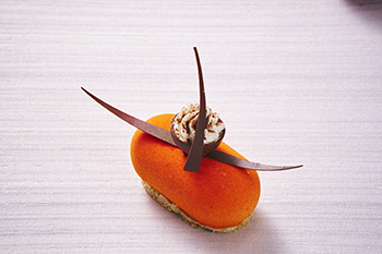 首里伝統「瑞泉酒造」の泡盛でマリネしたアプリコットとレーズン入りのヘーゼルナッツを合わせた土台に、泡盛ムースと紅芋ムースを乗せ、食感を楽しめるスイーツに仕上げました。