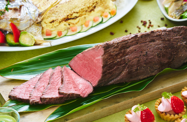- 低温でじっくり火入れした牛モモ肉は、驚くほどジューシーでやわらかく仕上げました。